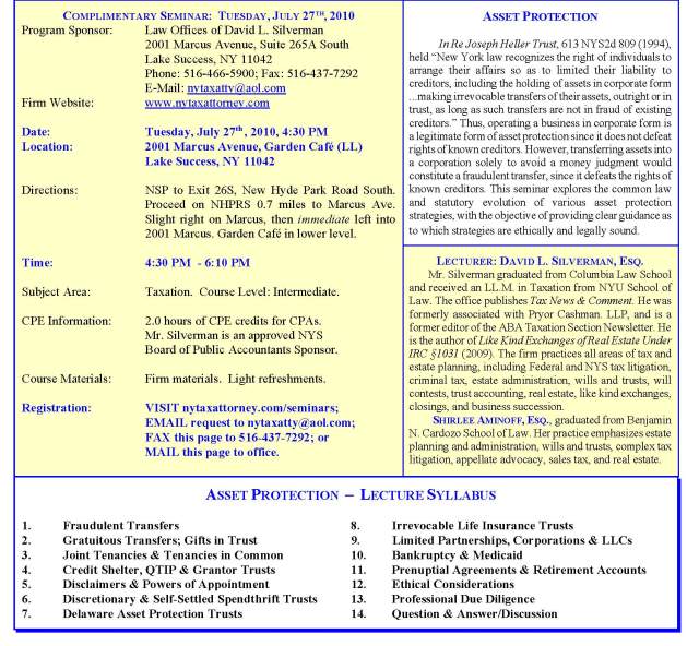 Asset Protection Seminar: July 27, 2010 in Lake Success, NY